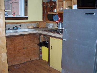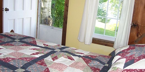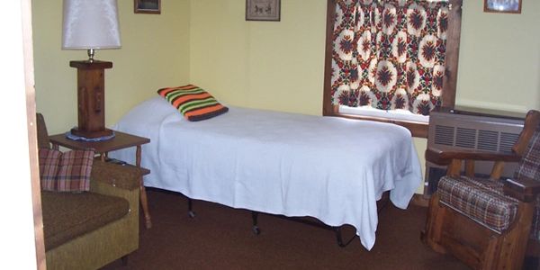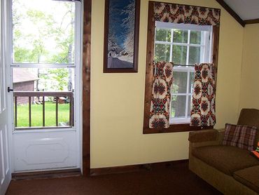 In the Twin Cottage, the complete kitchen and bathroom separate the bedroom with a queen-sized bed from the living room. There is a day bed and a love seat-sized sofa bed in the living room. This cottage is heated by a propane heater. There is a deck on the front of the cottage and a stone ring for campfires in front of the cottage.